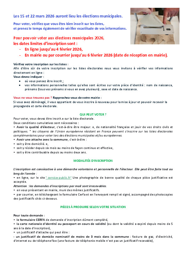 En mairie ou par courrier jusqu’au 6 février 2026 (date de réception en mairie).