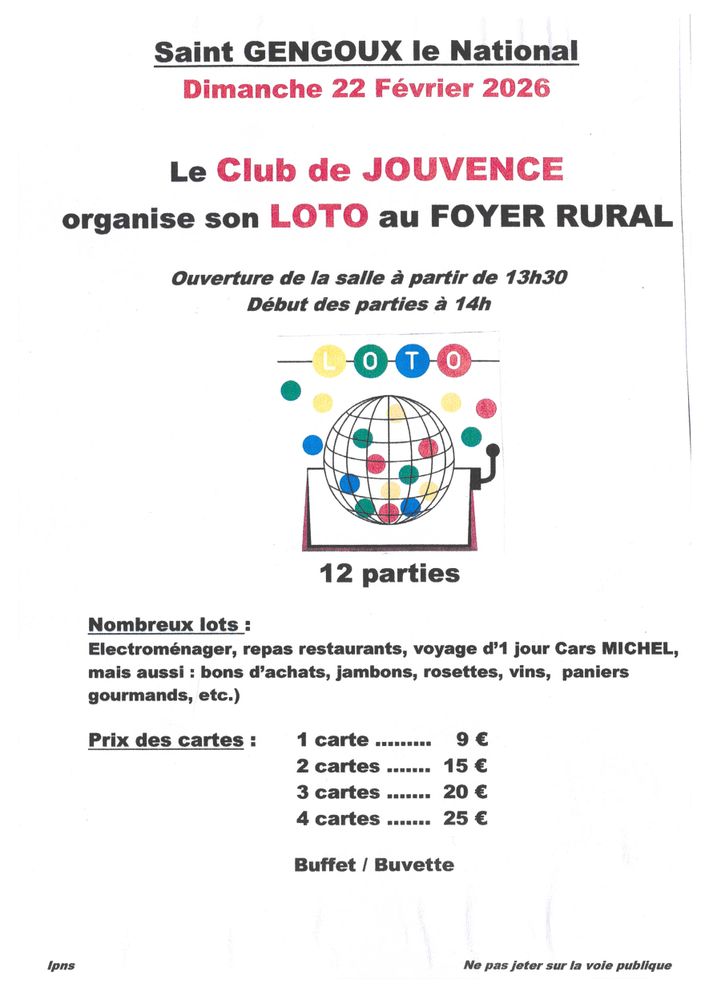 Réservation conseillée aux membres de l'amicale du don du sang de St Gengoux le National : 06 88 49 41 63 - 07 78 51 58 39 - 06 11 79 54 99