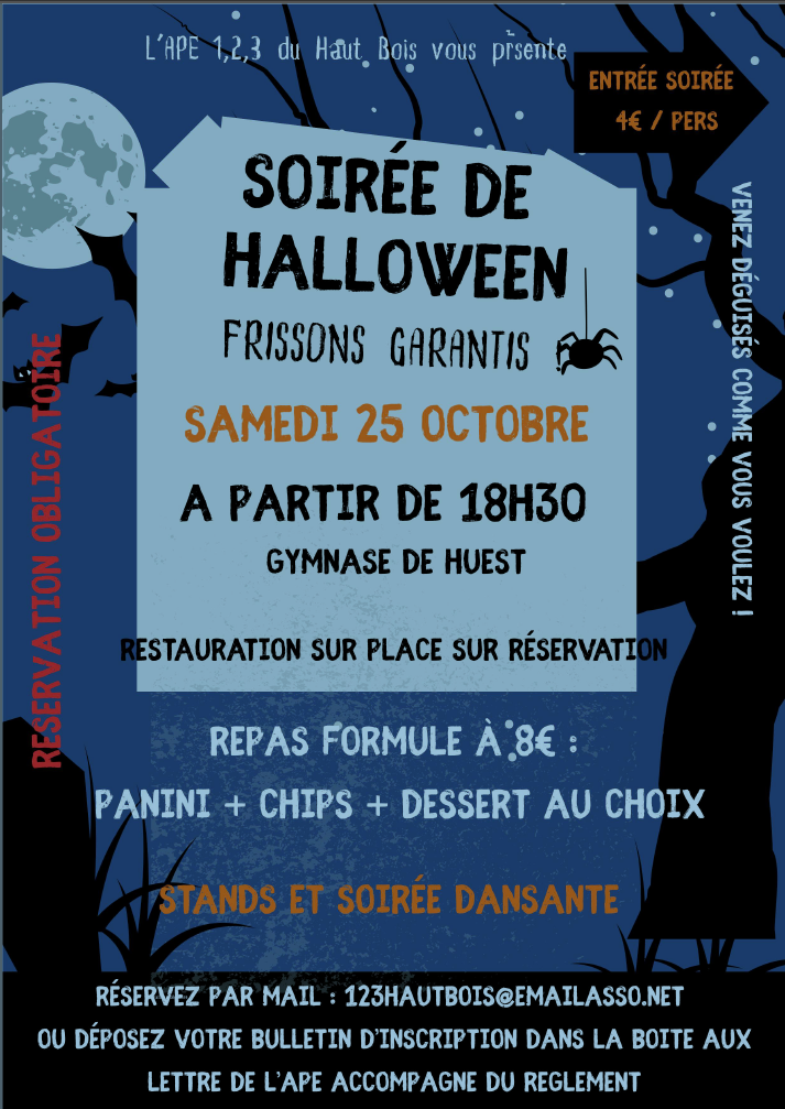 Cette année encore, l’« APE 1, 2, 3 … Haut Bois ! » vous propose sa traditionnelle soirée Halloween avec de nombreuses surprises et bal des monstres !