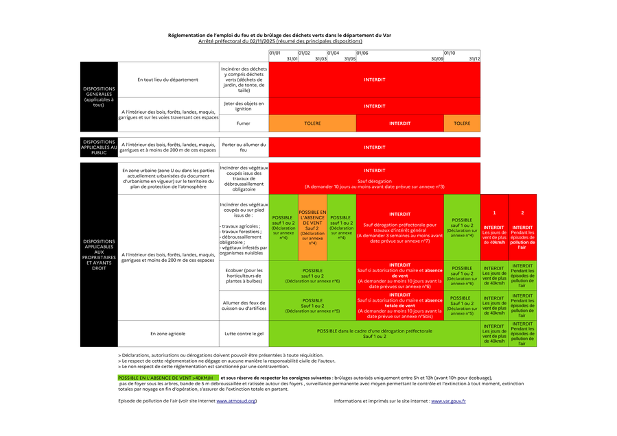 Tout autre type de végétaux brûlés doit faire l’objet d’une demande d’autorisation ou de dérogation, à l’exception des déchets verts qu’il est interdit de brûler toute l’année sur tout le territoire du Var. Pour rappel, les déchets verts sont des déchets d’origine végétale issus des activités de jardinage et de l’entretien des espaces verts, des serres, des zones récréatives, des jardins des particuliers et des terrains de sports. En Pj un tableau des périodes.