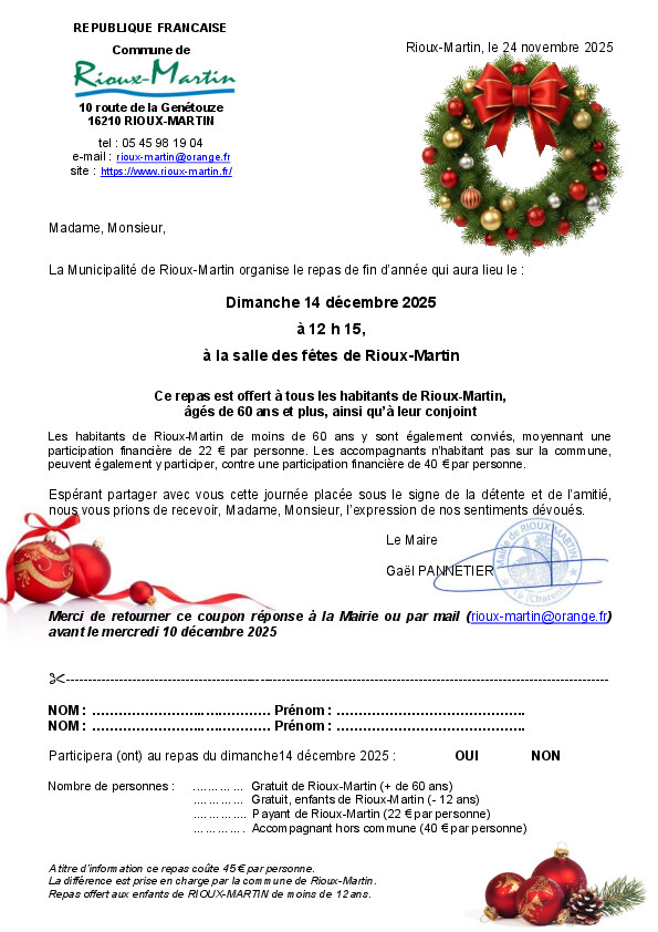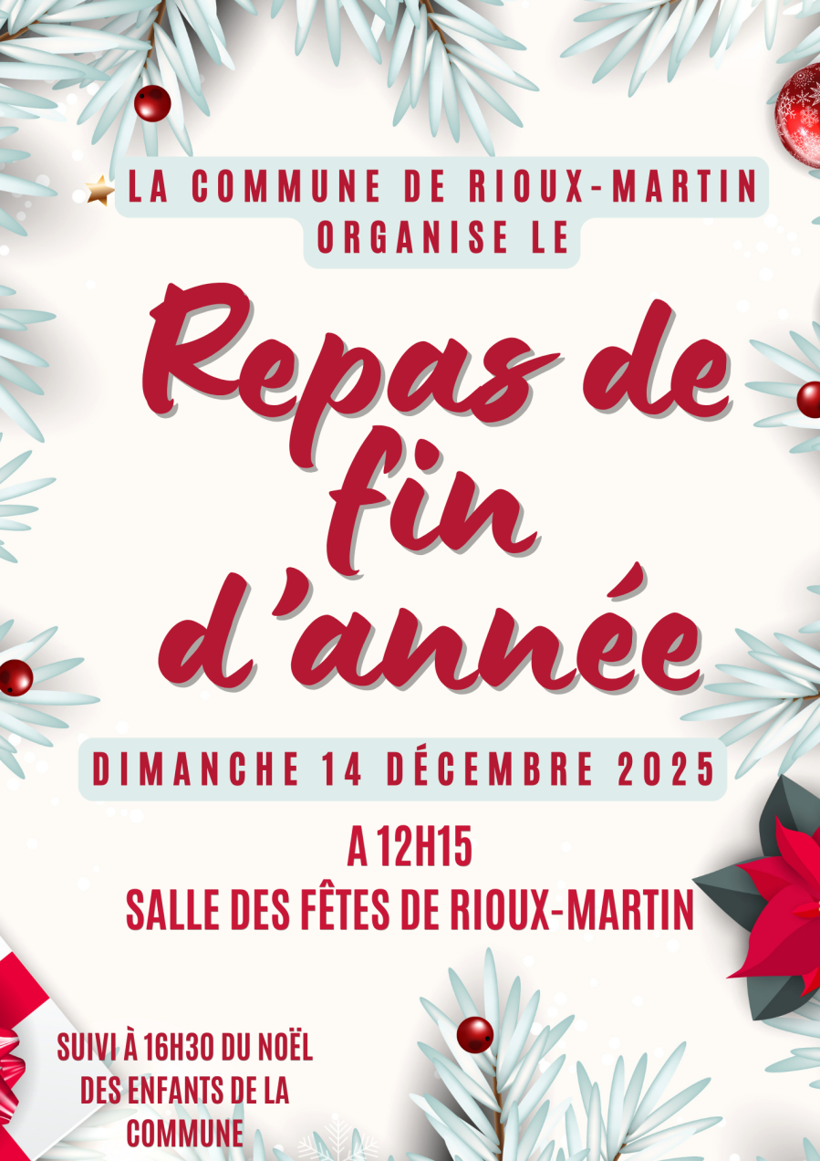 La Municipalité de Rioux-Martin organise le repas de fin d’année qui aura lieu le :