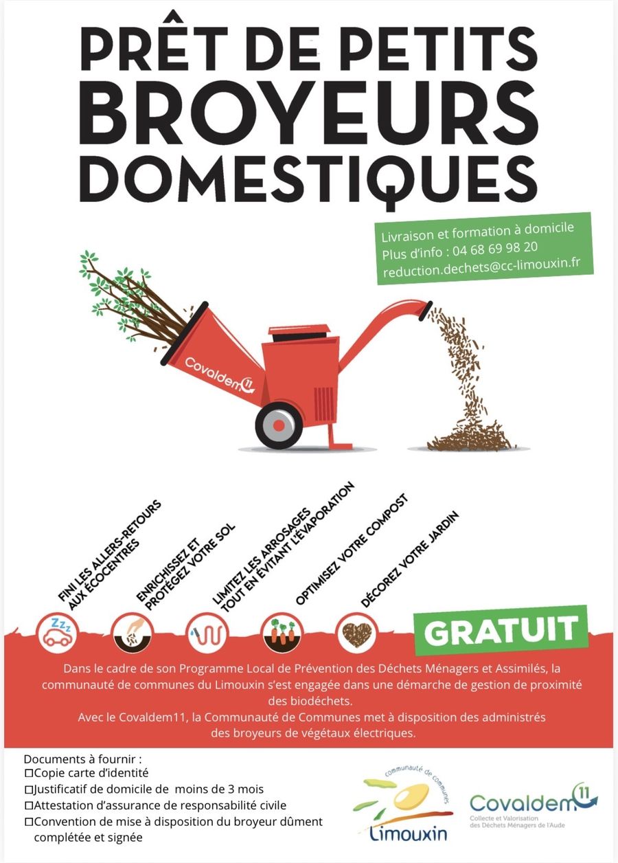 Dans le cadre de l’appel à projets « tri à la source des biodéchets », la Communauté de Communes du Limouxin met à disposition des habitants 5 broyeurs électriques pour végétaux de petit diamètre, fournis par le COVALDEM11.