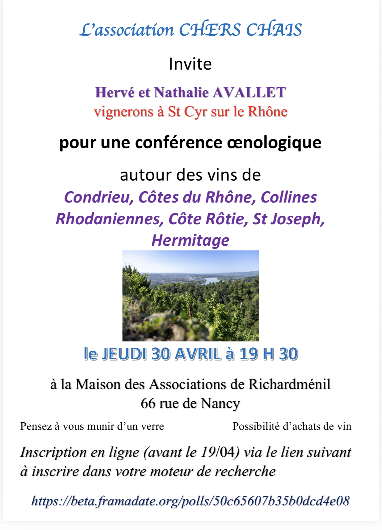 Inscription en ligne avant le 19/04 via le lien : https://beta.framadate.org/polls/50c65607b35b0dcd4e08