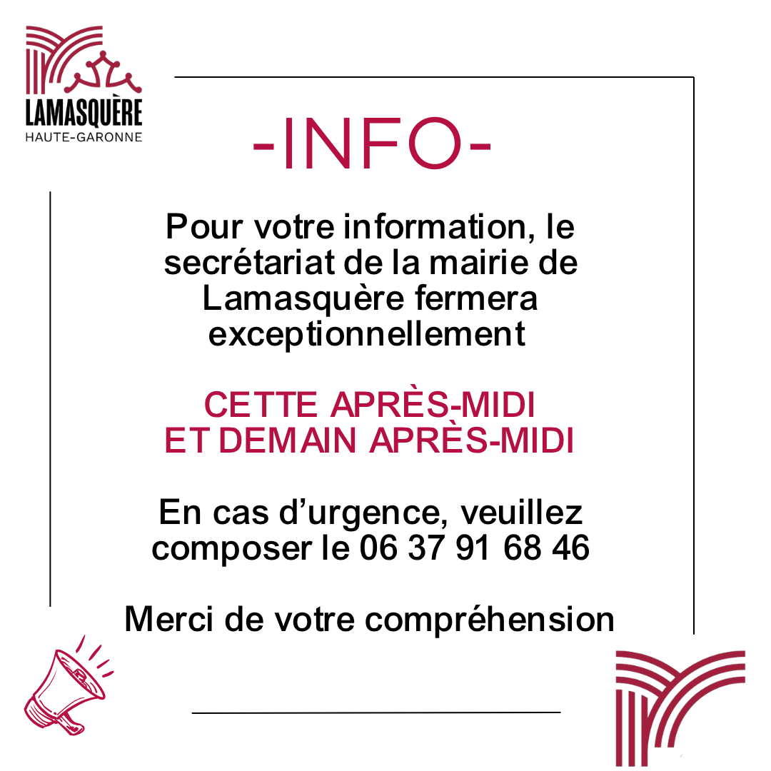 Pour votre information, le secrétariat de la Mairie de Lamasquère fermera exceptionnellement