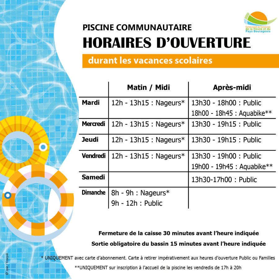 📆 Du lundi 20 octobre au dimanche 2 novembre 2025, la piscine communautaire vous accueille aux horaires ci-dessous 👇