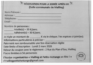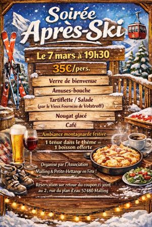 La soirée Après-ski qui avait été initialement prévue le samedi 7 mars a été supprimée compte tenu du peu d'inscription.