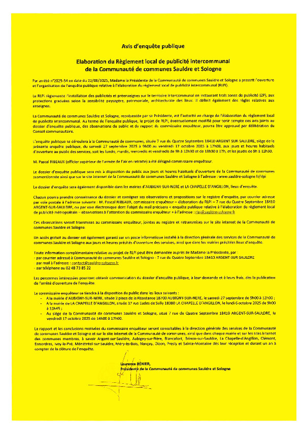 Règlement Local de Publicité Intercommunal de la communauté de communes Sauldre et Sologne.