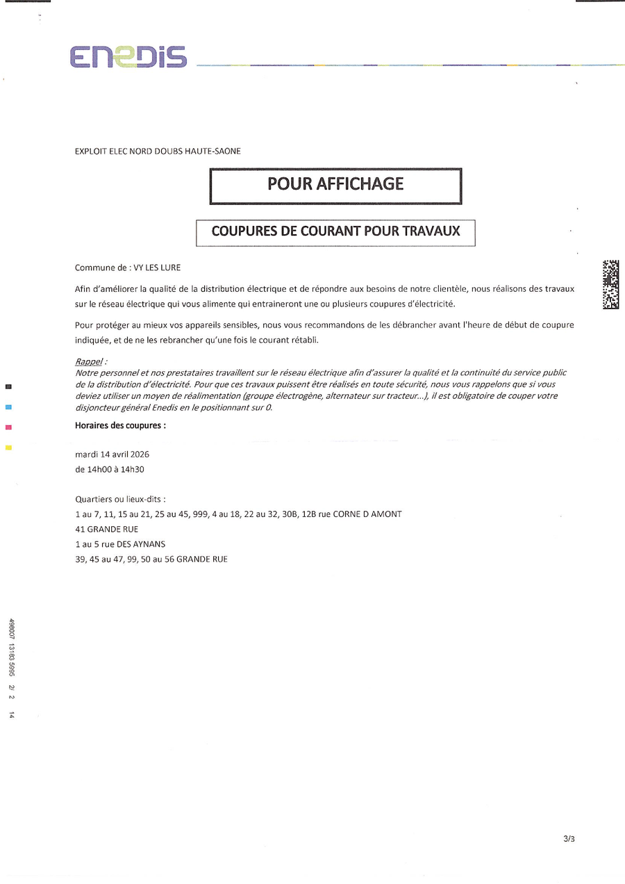 ENEDIS nous informe qu'une coupure de courant est prévue :
