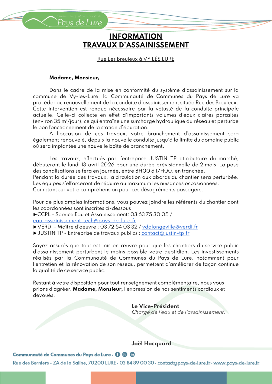 💡 Cette opération s'intègre dans le projet global de mise en conformité du système d'assainissement de Vy-lès-Lure, qui comprend: