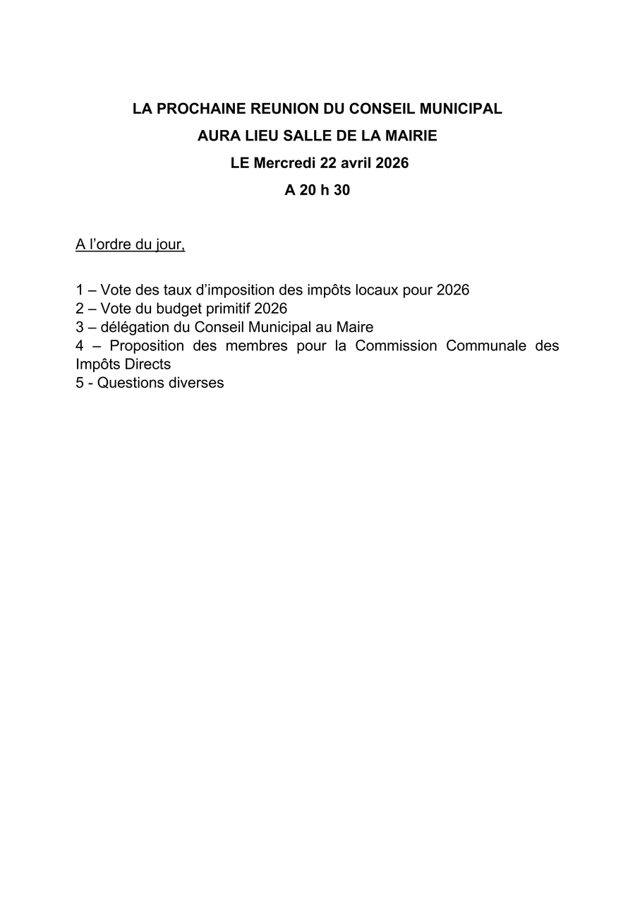 En raison d'un arrêt maladie jusqu'au 19 avril, les horaires d'ouverture au public sont modifiés. Merci d'appeler le secrétariat ou Monsieur le Maire en cas d'urgence au 06 47 96 53 35