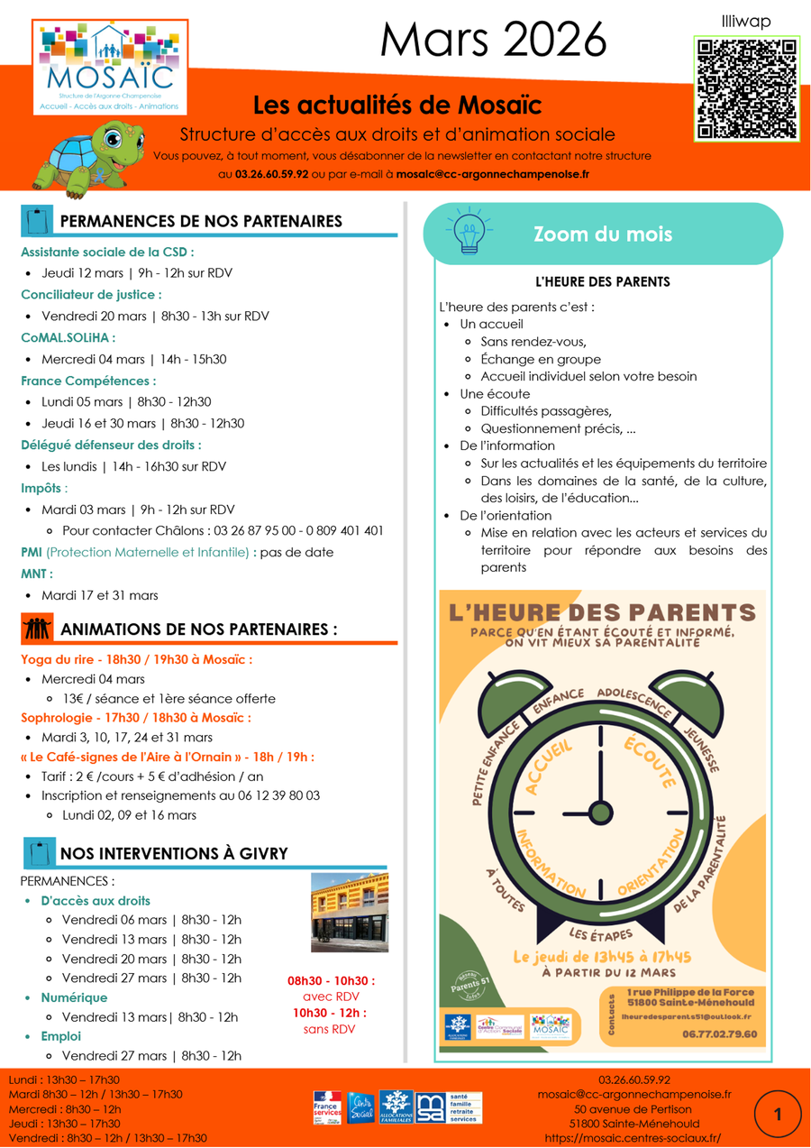 En complément aux permanences habituelles, Mosaïc a le plaisir de vous informer de l’organisation de permanences gratuites assurées par des professionnels de France Services au tiers-lieu de Givry en Argonne pour le premier trimestre 2026.