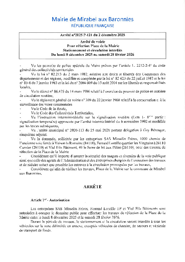 Les travaux de réfection du parking de la mairie débuteront le 8 décembre 2025 et s'achèveront le 28 février 2026.