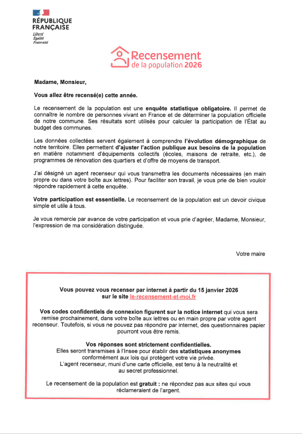Je vous prie de trouver ci-joint un courrier explicatif ainsi qu'une photo des agents recenseurs qui seront vos interlocuteurs pendant toute la durée du recensement.
