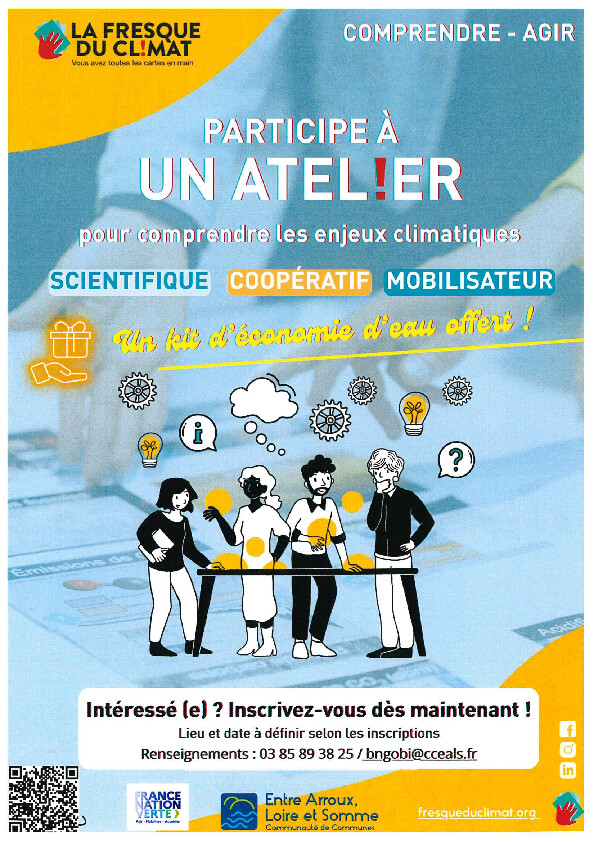 La Communauté de Communes Entre Arroux, Loire et Somme vous propose de participer à un atelier de la Fresque du climat, un outil ludique, scientifique et coopératif pour mieux comprendre les enjeux climatiques.