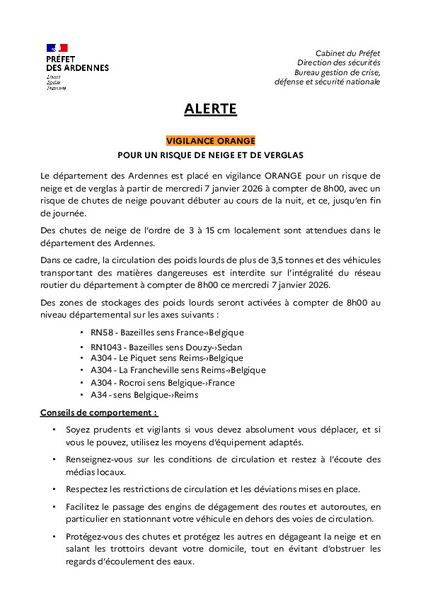 EST PLACÉ EN VIGILANCE "ORANGE"NEIGE/VERGLAS