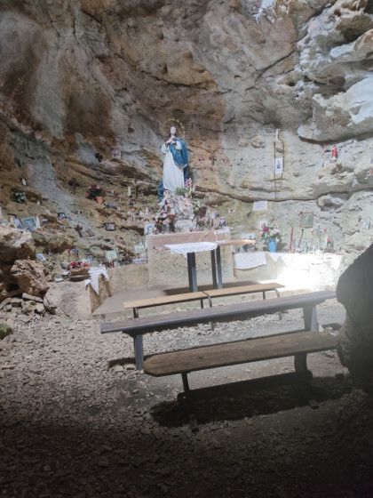 "Notre-Dame de Calern, grotte-chapelle troglodyte, domine le petit village de Caussols"