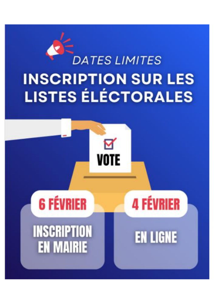 La date limite pour s'inscrire en mairie (guichet) ou par voie postale est le 6 février. Vous devrez fournir les documents suivants :