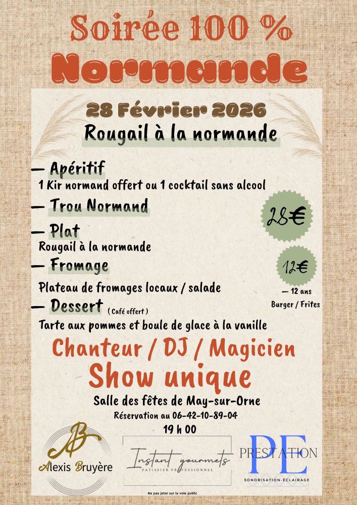 Venez profiter samedi 28 février d'une soirée 100% Normande à la salle des fêtes de May sur Orne.