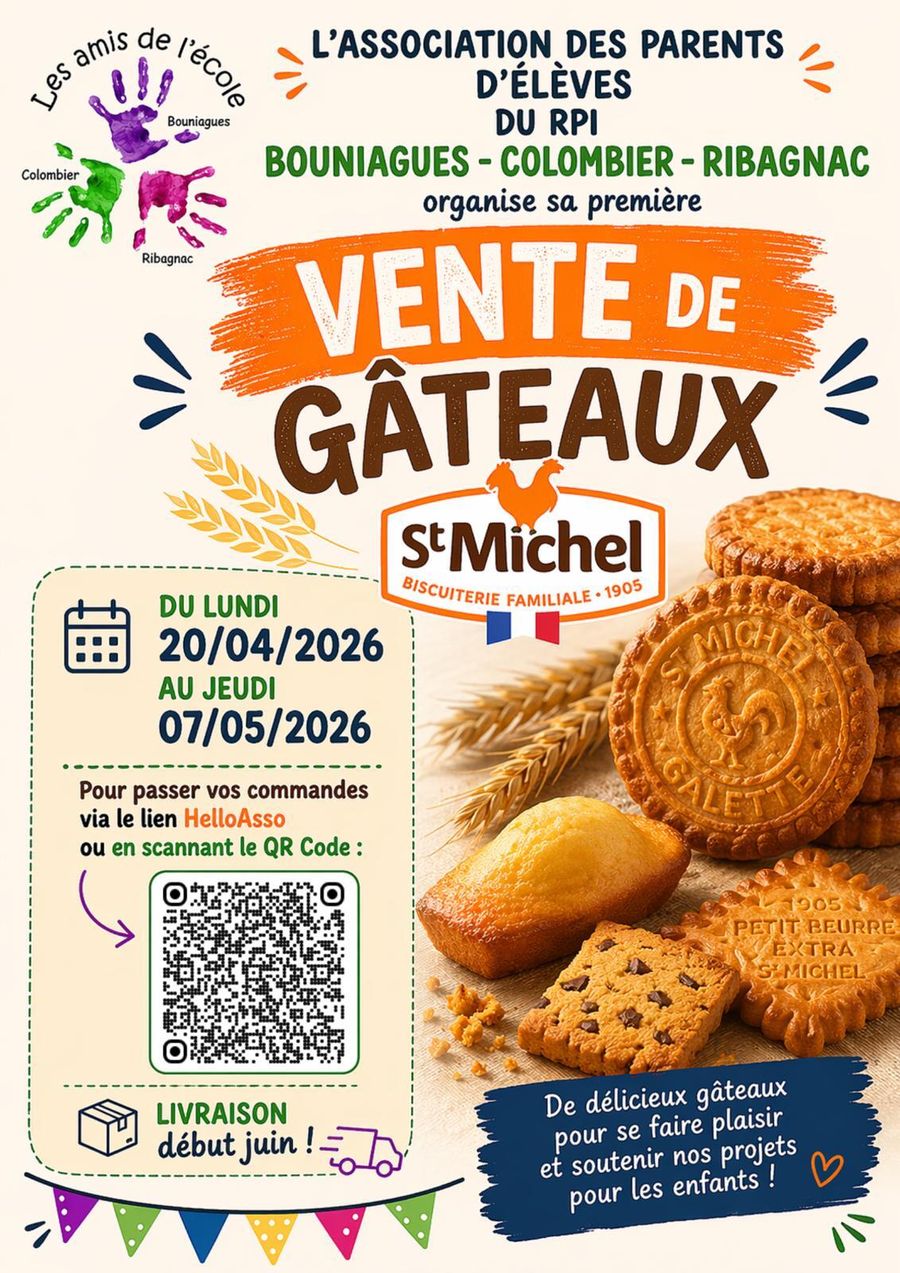 👉 Commandes en ligne via HelloAsso (QR code sur l’affiche ou avec le lien suivant : https://www.helloasso.com/associations/les-amis-de-l-ecole-bouniagues-colombier-ribagnac/boutiques/vente-gateaux-st-michel)