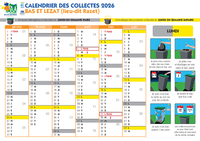 Vous trouverez ci-dessous les calendriers de collecte des ordures ménagères pour 2026 sur Bas-et-Lezat (premier calendrier), sur le lieu-dit de Razet (second calendrier), ainsi que les consignes de collecte transmises par le SBA.