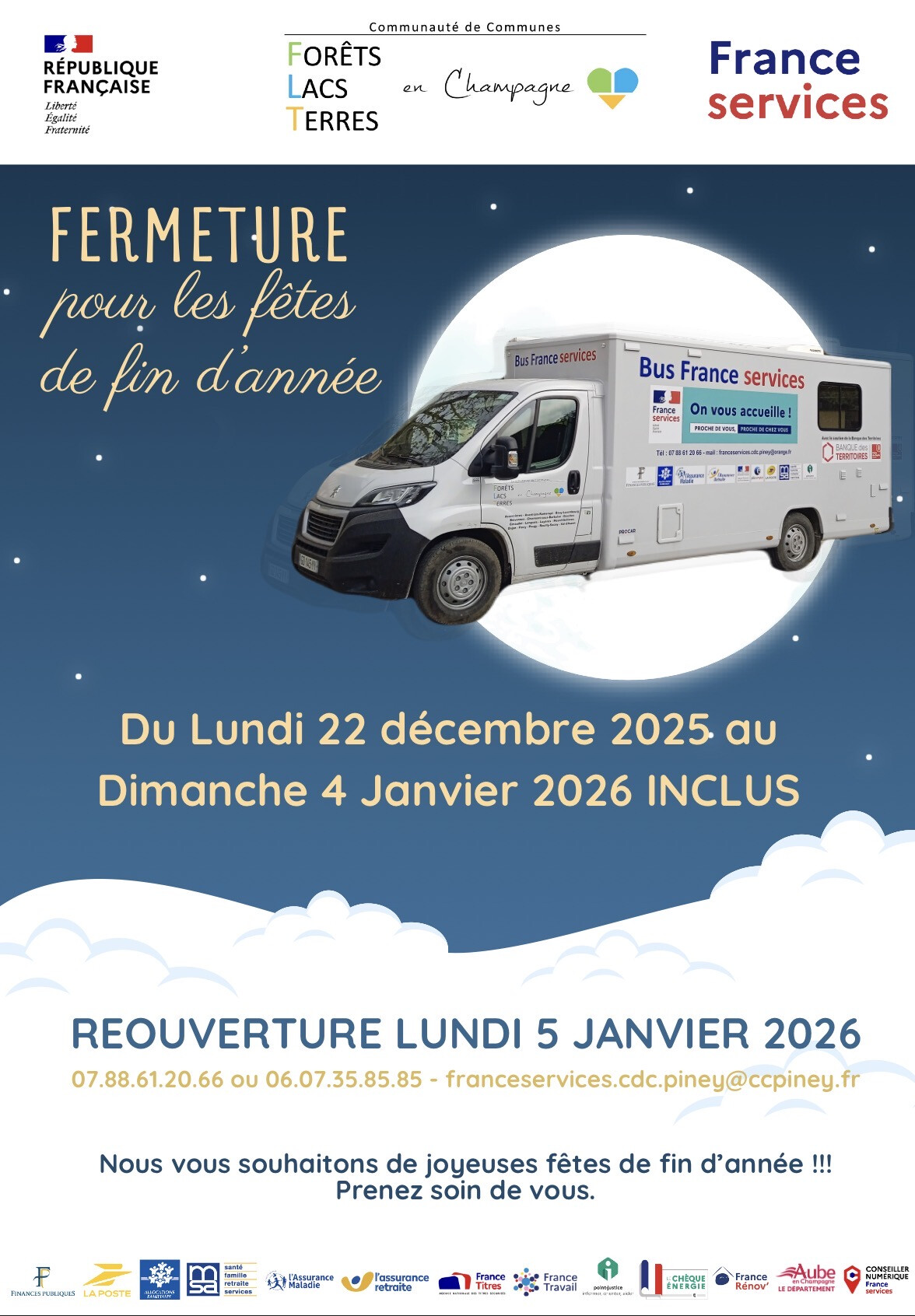 La mairie de Géraudot sera fermée à partir du lundi 22 décembre 2025 à 19h00 au lundi 5 Janvier à 14h00.