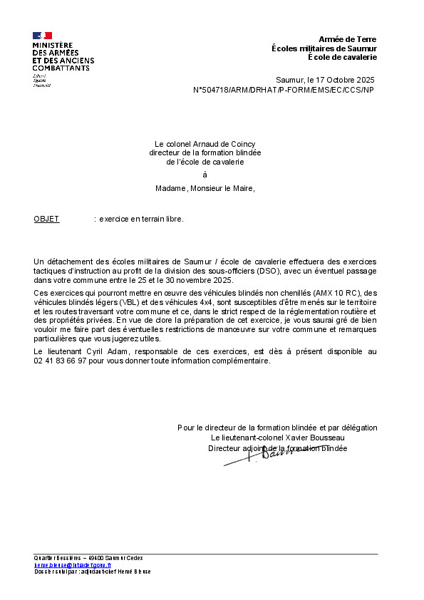 Veuillez trouver en pièce jointe une lettre du directeur de la formation blindée de l’école de cavalerie concernant des exercices qui se dérouleront dans votre région entre le 25 et le 30 novembre 2025.