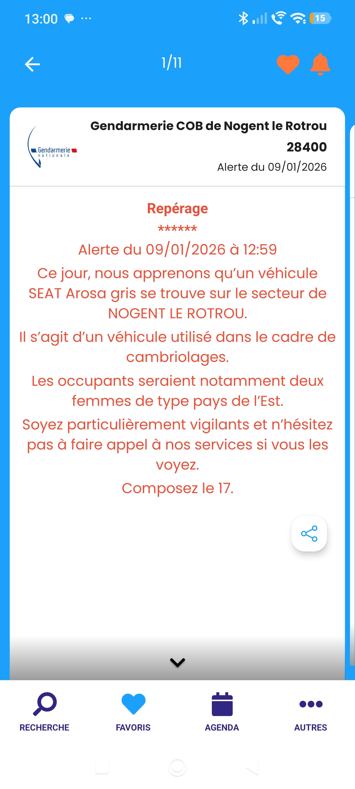 La gendarmerie de Nogent le Rotrou nous signale un véhicule faisant du repérage soyez vigilant.