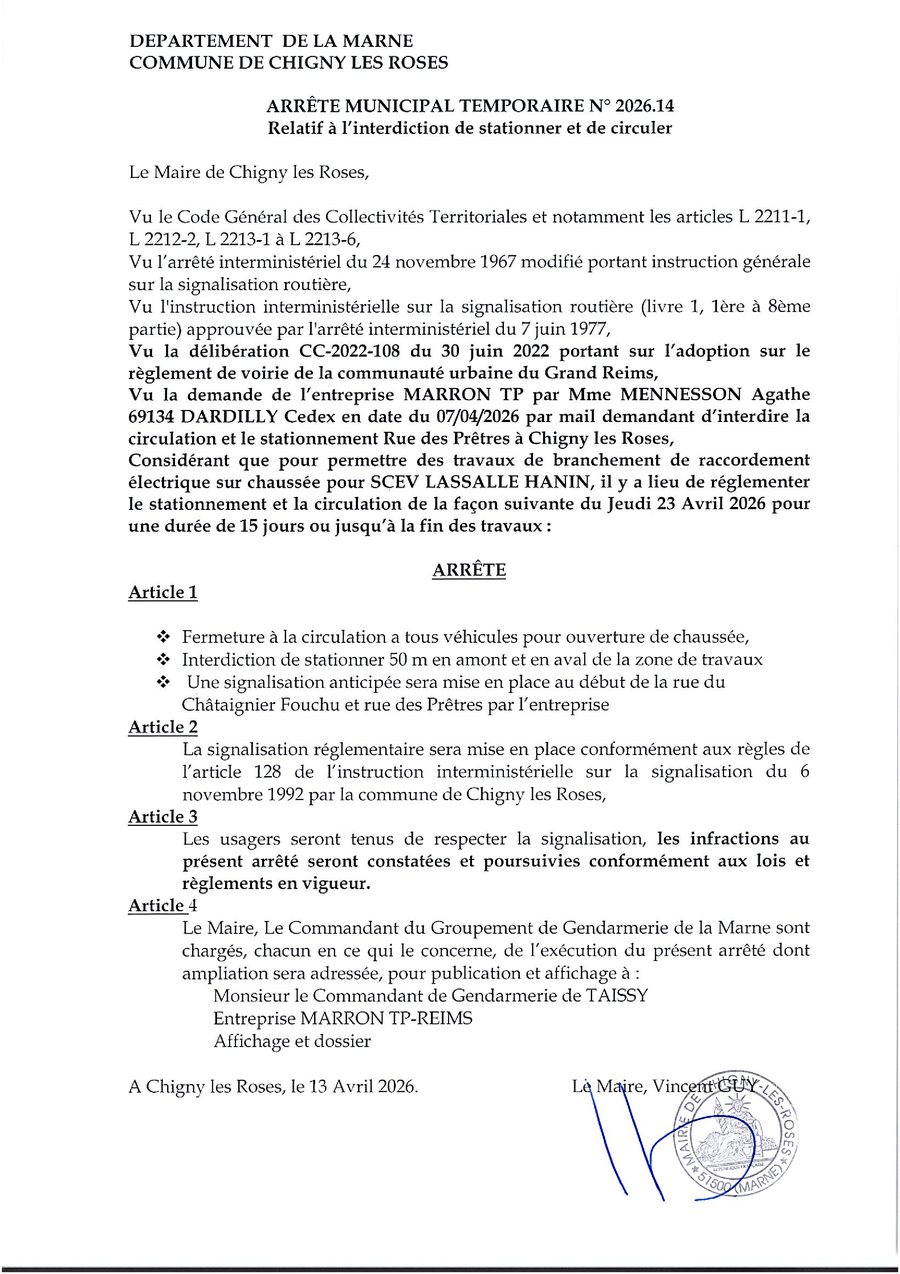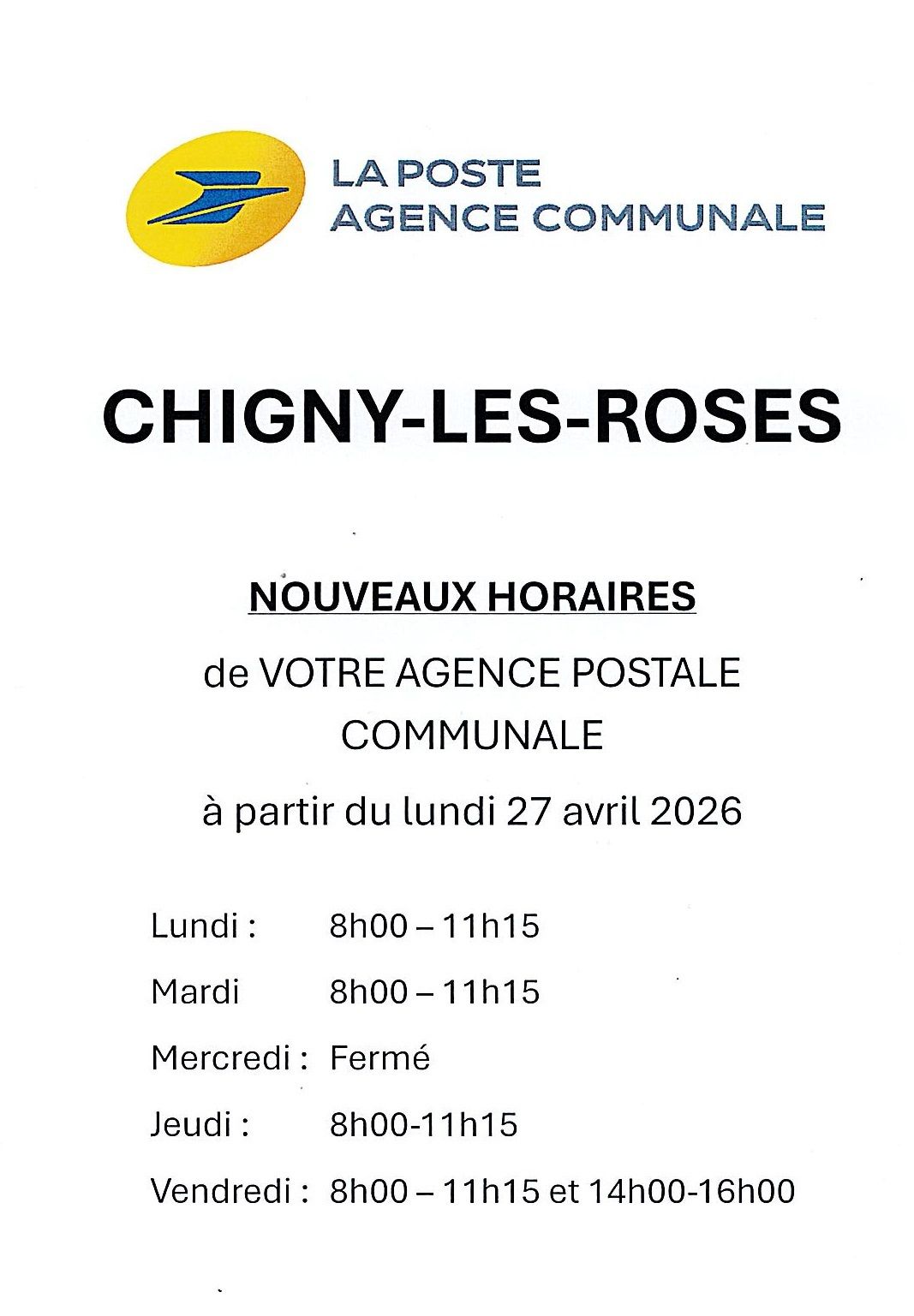 Le secrétariat de Mairie sera fermé du Mercredi 29 Avril 2026 à 17h00 au Lundi 11 Mai 2026 à 10h00 ainsi que le Vendredi 15 Mai 2026.