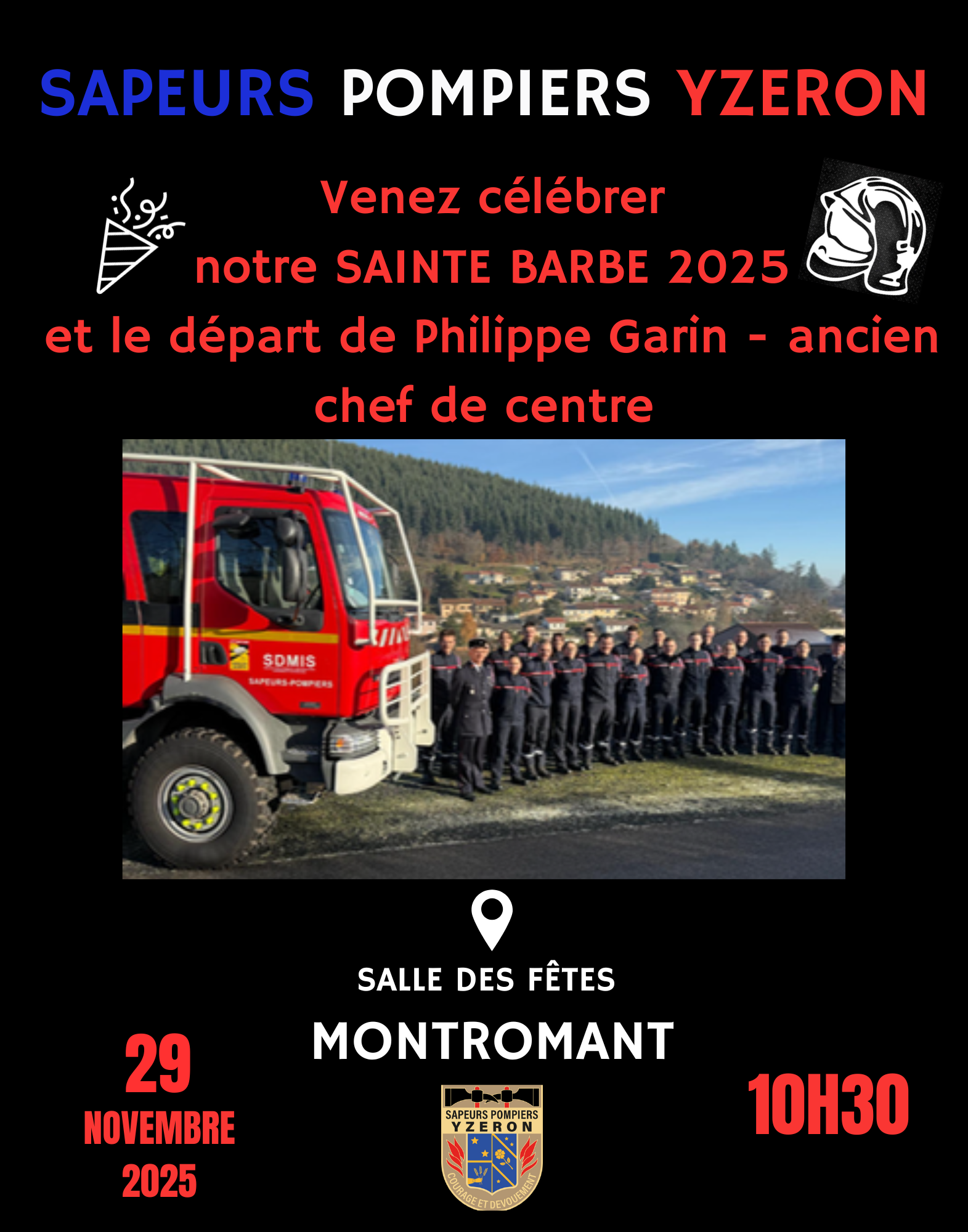 Les sapeurs-pompiers d’Yzeron ont le plaisir de vous convier à la célébration de leur SAINTE-BARBE 2025 🚒