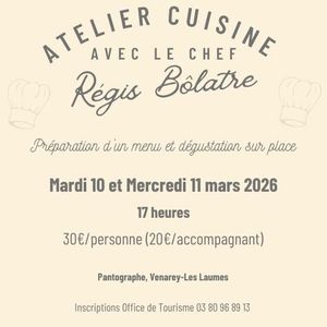 Le chef Régis BOLATRE vous propose un cours de cuisine où vous préparerez ensemble un délicieux menu, dans une ambiance détendue et chaleureuse. Que vous soyez débutant(e) ou passionné(e), l’idée est avant tout de partager un bon moment, apprendre quelques astuces… et surtout se régaler !