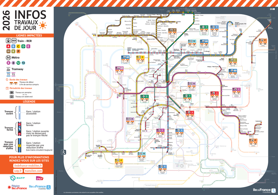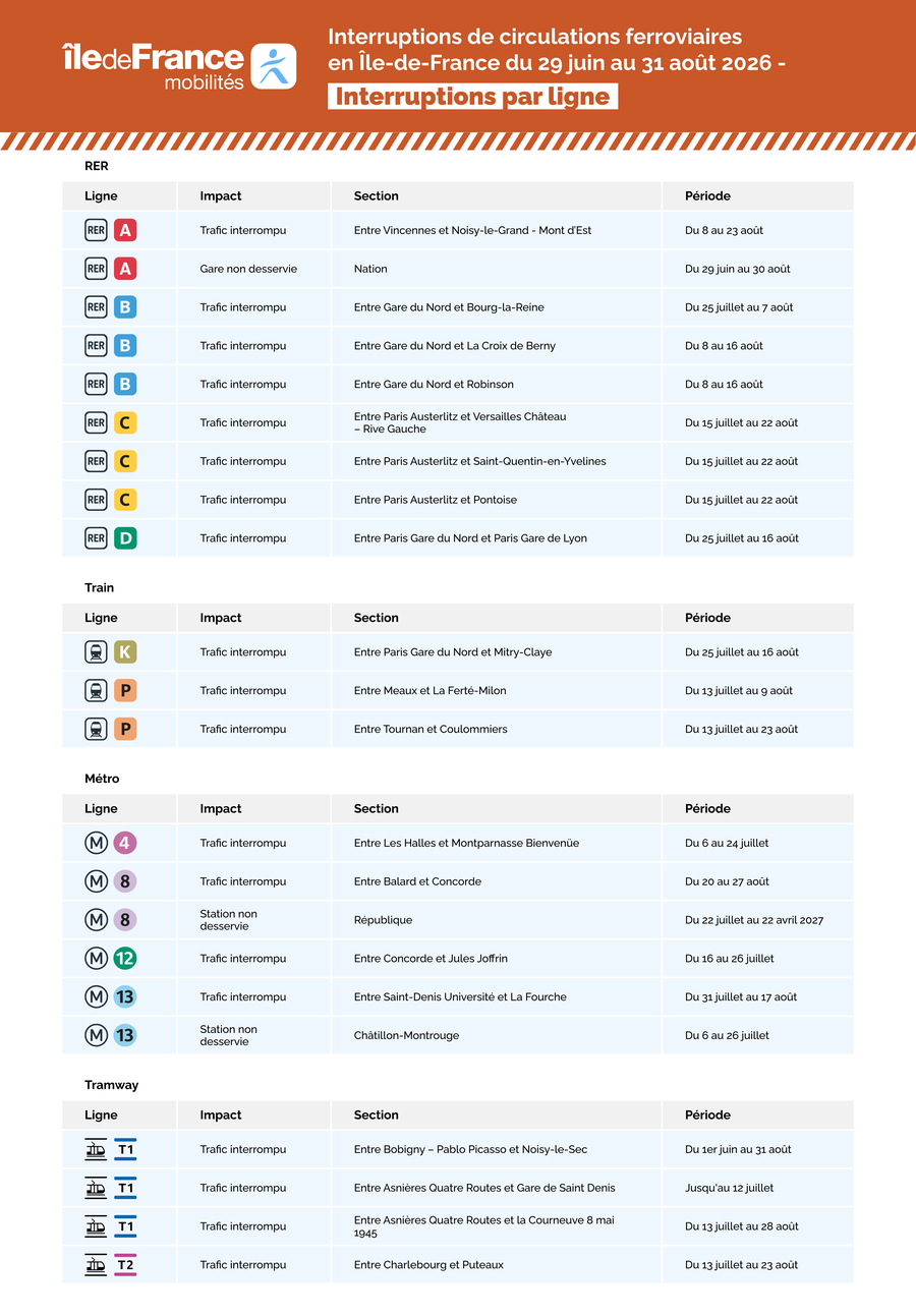En 2026, ces travaux d'été seront particulièrement impactants. De nombreuses lignes seront interrompues, d'autres connaîtront des réductions d'offre, sur des périodes pouvant s'étendre sur plusieurs semaines. Consciente des difficultés que les usagers vont rencontrer, Île-de-France Mobilités fait tout son possible pour informer les voyageurs et leur apporter des conseils adaptés.