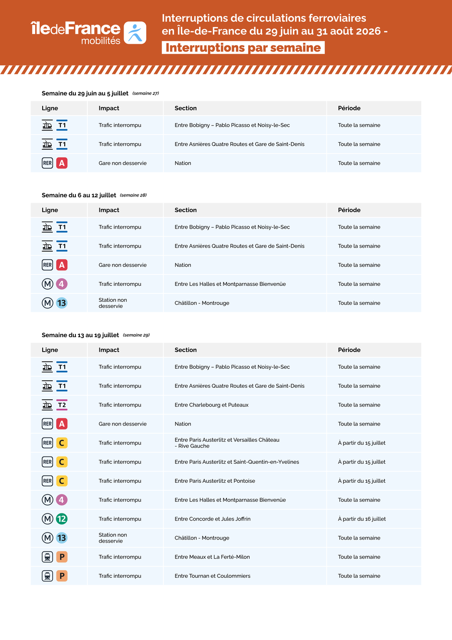 Le détail des principales perturbations prévues entre le 1er juillet et le 31 août 2026 est présenté dans les tableaux (listes par date et par ligne) et la carte ci-joints.