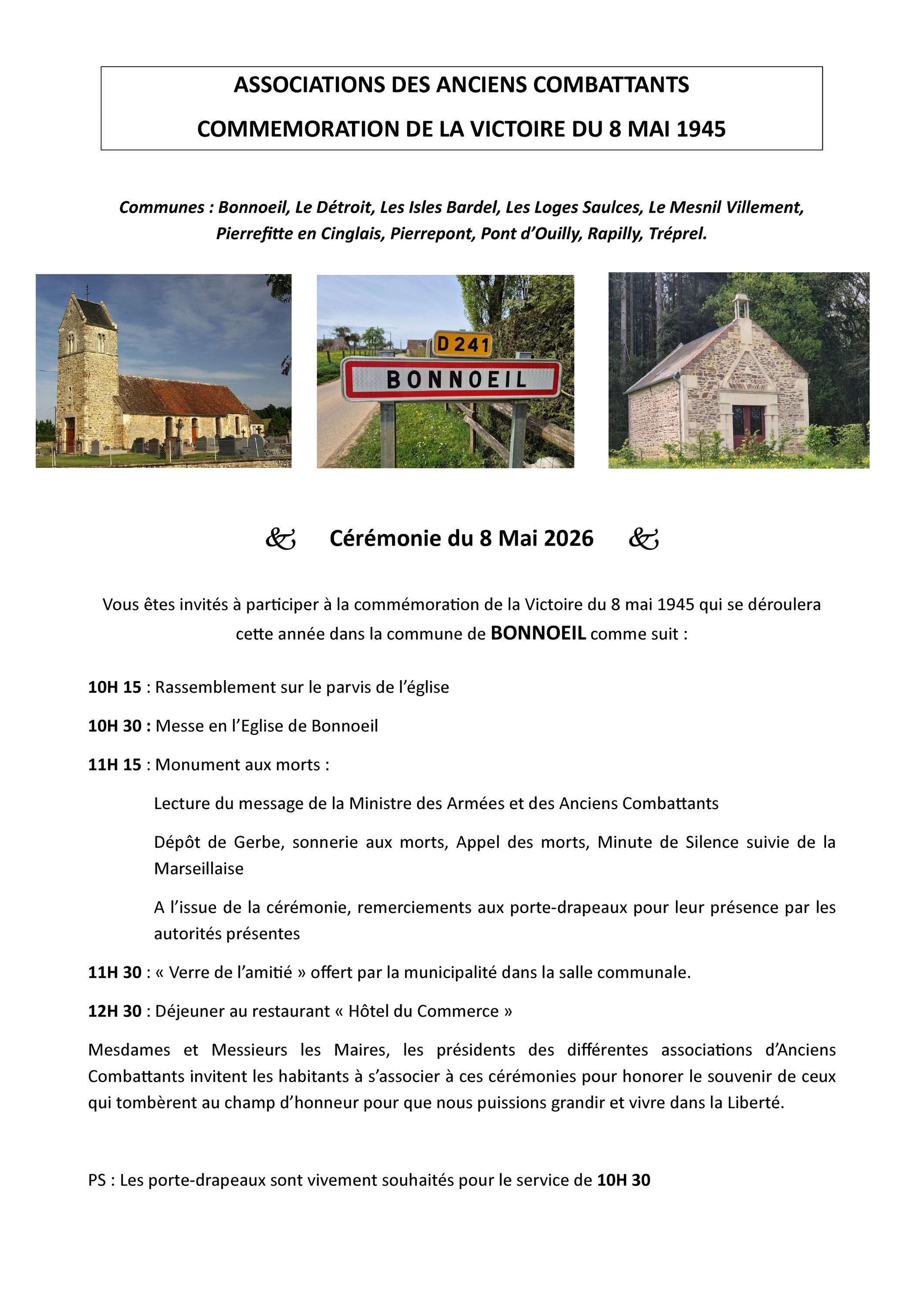 Rendez-vous le 8 mai 2026 à Bonnoeil pour honorer la mémoire de celles et ceux qui ont combattu pour notre liberté 🕊️