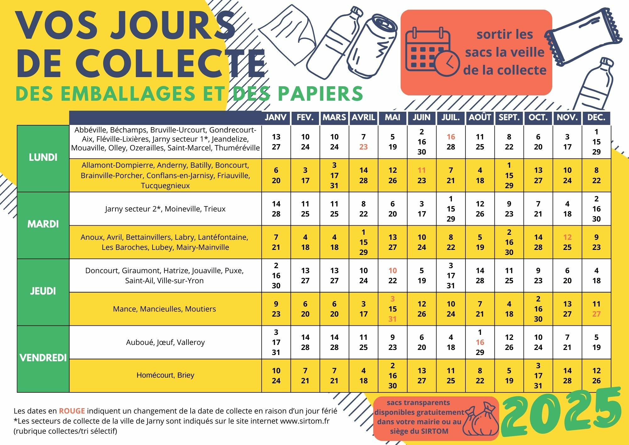 ATTENTION, NOUVELLES DATES DE COLLECTE DU TRI, MERCI DE TENIR COMPTE DES CHANGEMENTS.