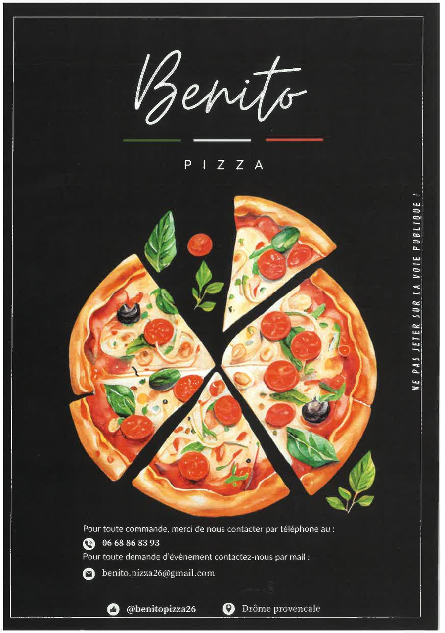 Le camion de pizza "Benito Pizza" est présent tous les vendredis à partir de 18H sur le parking en face de la mairie.