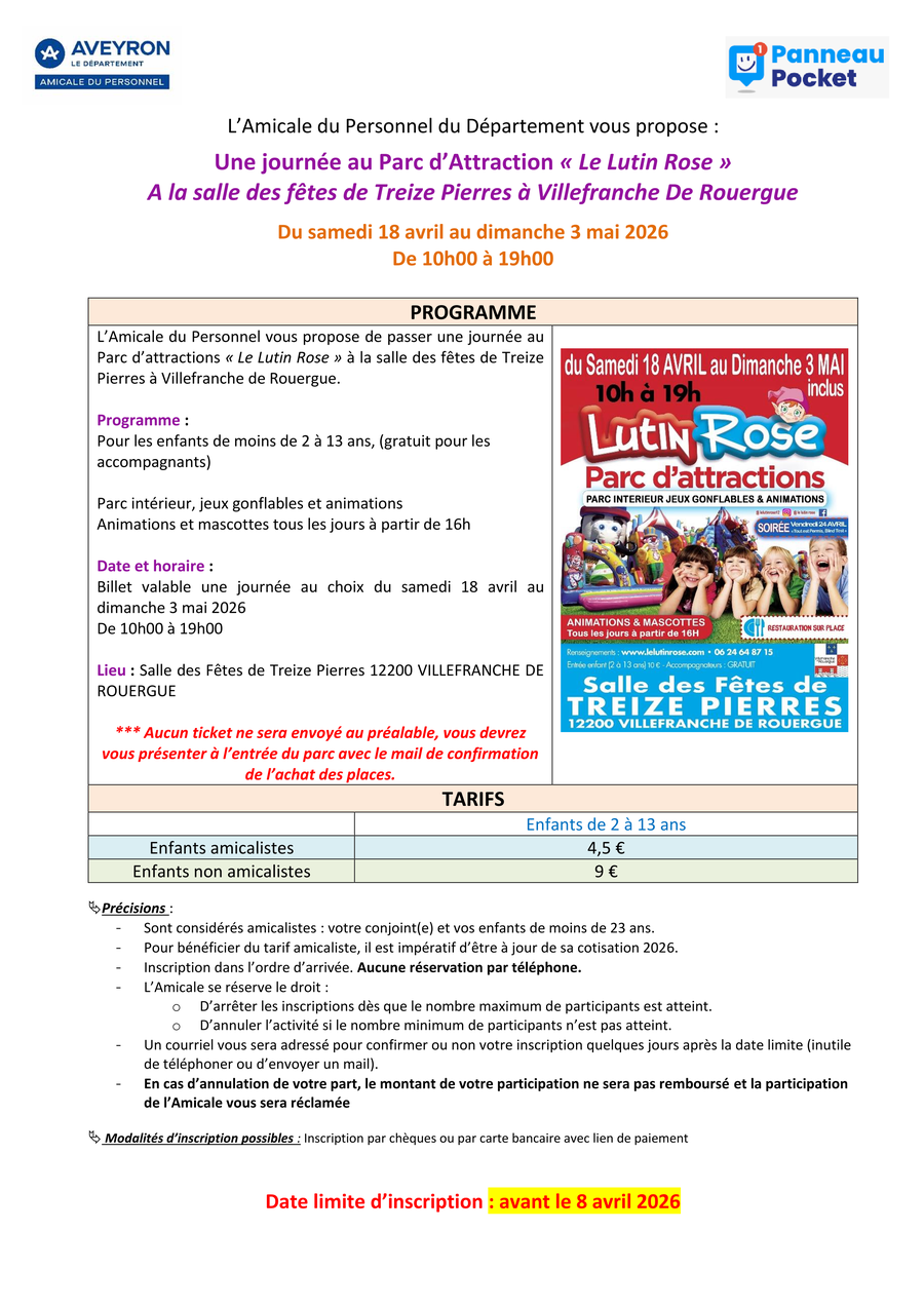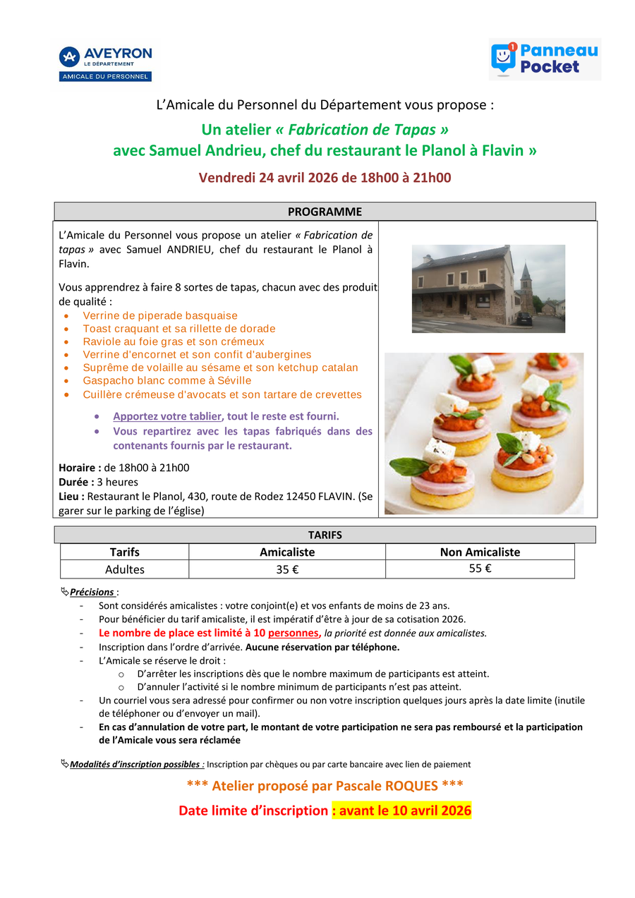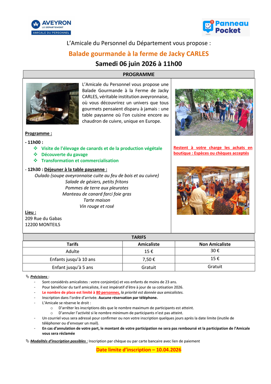 Inscrivez-vous en envoyant votre bulletin d’inscription avec le règlement par chèque, à l’ordre de l’Amicale du Personnel du Département,