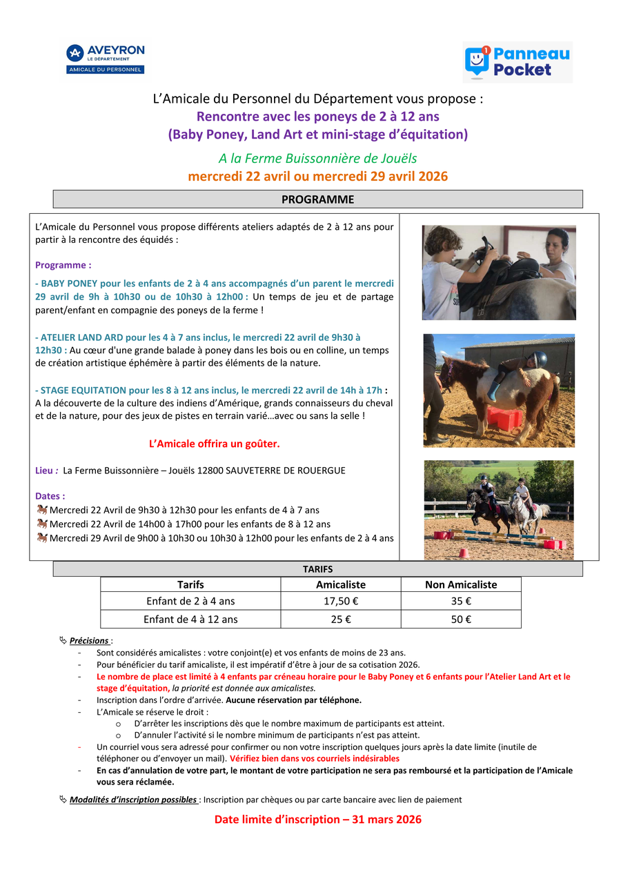 Envoyez votre inscription par mail à Cathy VAYRE et Anne-Laure BOULOC qui s'occupent de la gestion de l'activité avant le 31 mars 2026.