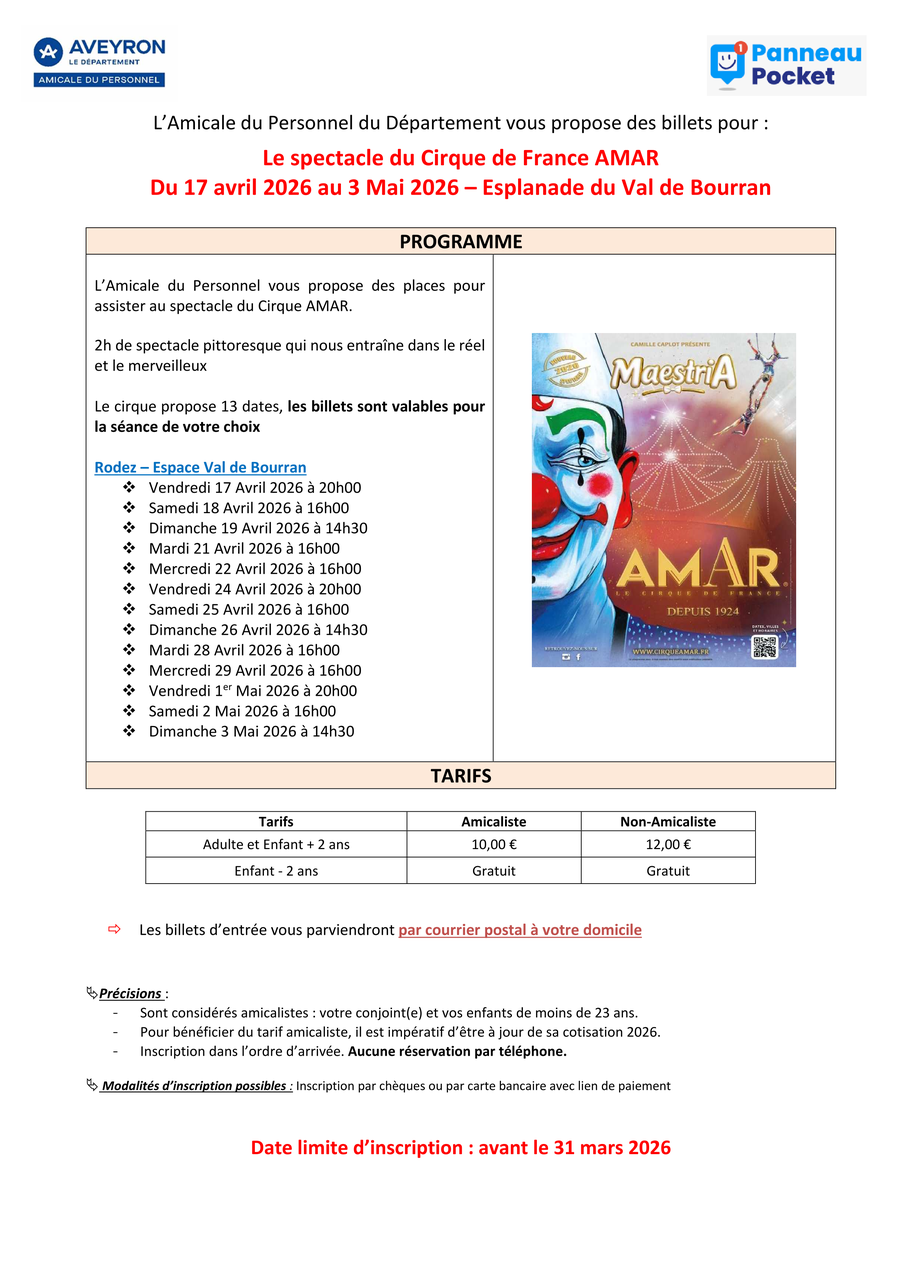 L'Amicale du Personnel vous propose des places pour le spectacle du Cirque de France AMAR : du 17 avril au 3 mai 2026.
