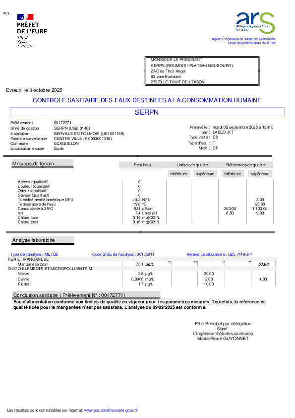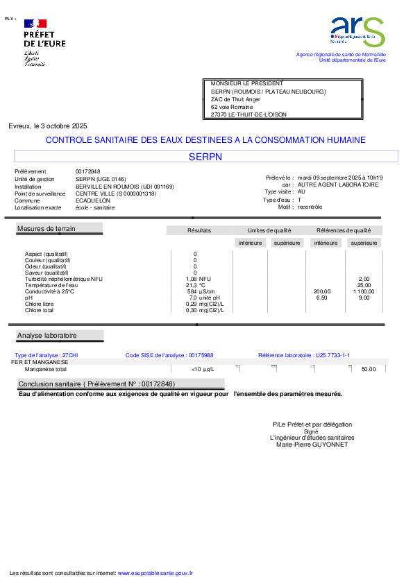 CONTRÔLE SANITAIRE DES EAUX destinées A LA CONSOMMATION HUMAIN