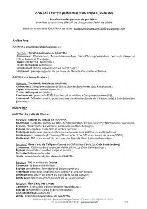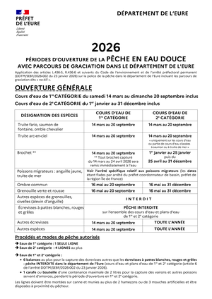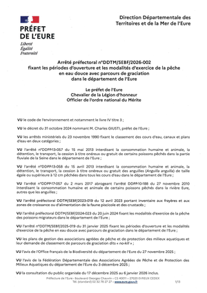 - AP DDTM/SEBF 2026-002 du 23 janvier 2026 fixant les pĂ©riodes dâouverture et les modalitĂ©s dâexercice de la pĂȘche en eau douce avec parcours de graciation dans le dĂ©partement de l'Eure ;