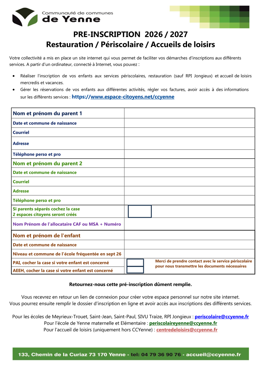 •Gérer les réservations de vos enfants aux différentes activités, régler vos factures, avoir accès à des informations sur les différents services : www.espace-citoyens.net/ccyenne