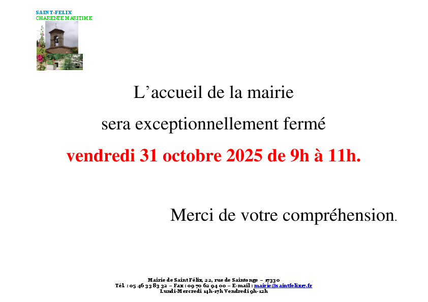 L'accueil de la mairie sera exceptionnellement fermé vendredi 31 octobre 2025