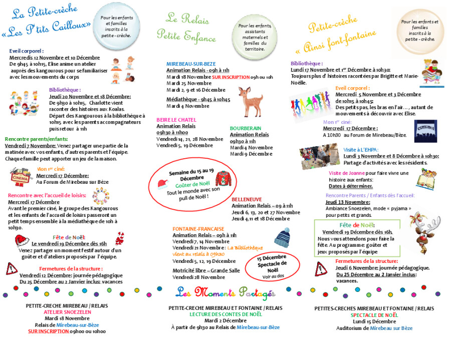 👉 Si vous souhaitez que votre enfant soit accueilli en collectivité, n’hésitez pas à vous renseigner auprès du Relais Petite Enfance en appelant le 03 80 72 80 89 ou par mail au rpe@mfcc.fr