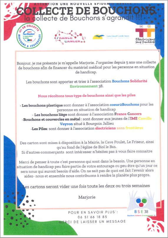 Nous collectons également pour des associations des piles usagées ainsi que des bouchons plastiques.