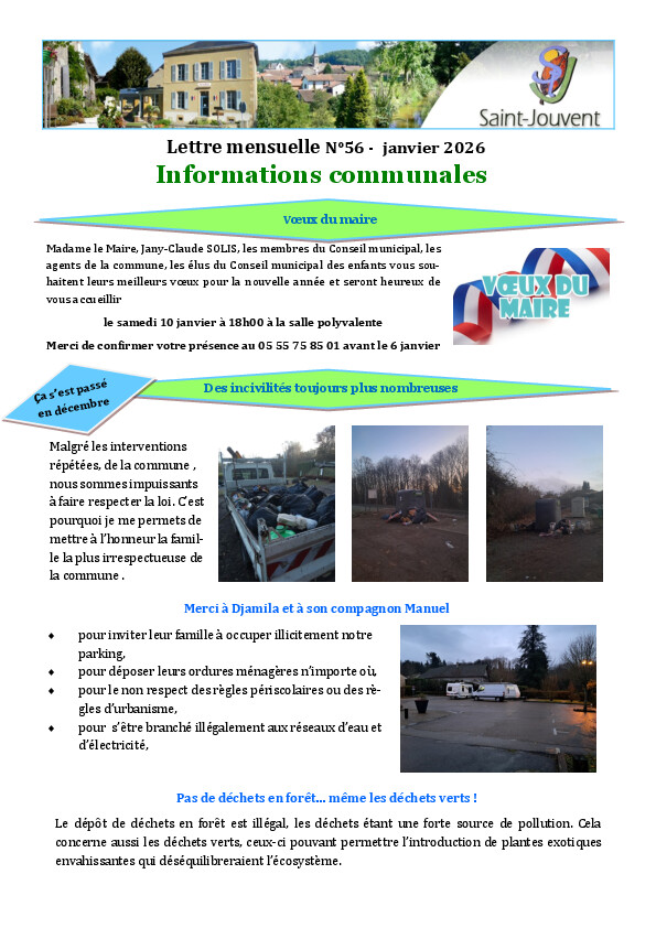 le 31 janvier 2026 (CV, références professionnelles, lettre de motivation et projet d’exploitation), à envoyer par courrier à : Mairie - 9 rue de la Fontaine - 87430 ST LEGER LA MONTAGNE, ou par mail à mairie@saintlegerlamontagne.fr et elles seront présentées devant le conseil municipal.