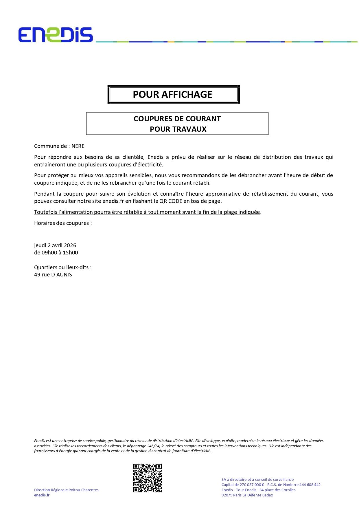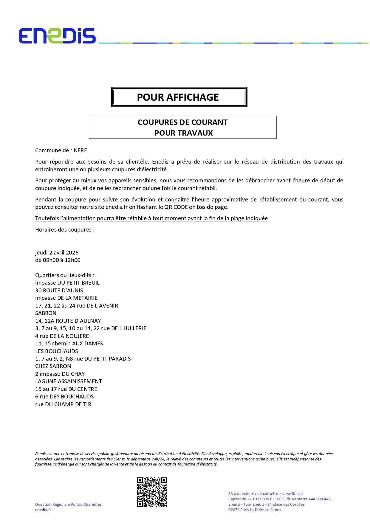 Jeudi 02 avril 2026 entre 09h00 et 12h00