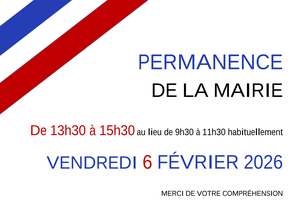 En raison d'une formation de la secrétaire de mairie, la permanence initialement prévue le vendredi 6 février le matin est modifiée.