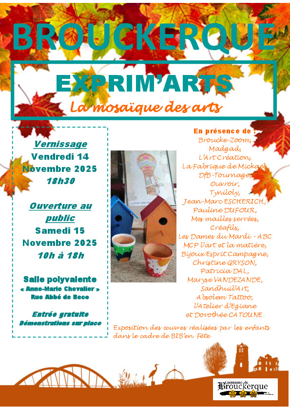 Les Vendredi 14 novembre de 14h à 18h et Samedi 15 novembre de 10h à 18h dans la salle polyvalente (à l’occasion d’Exprim’Arts) : Les œuvres réalisées par les enfants seront présentées et seront ensuite installées dans les différents espaces verts de la commune.