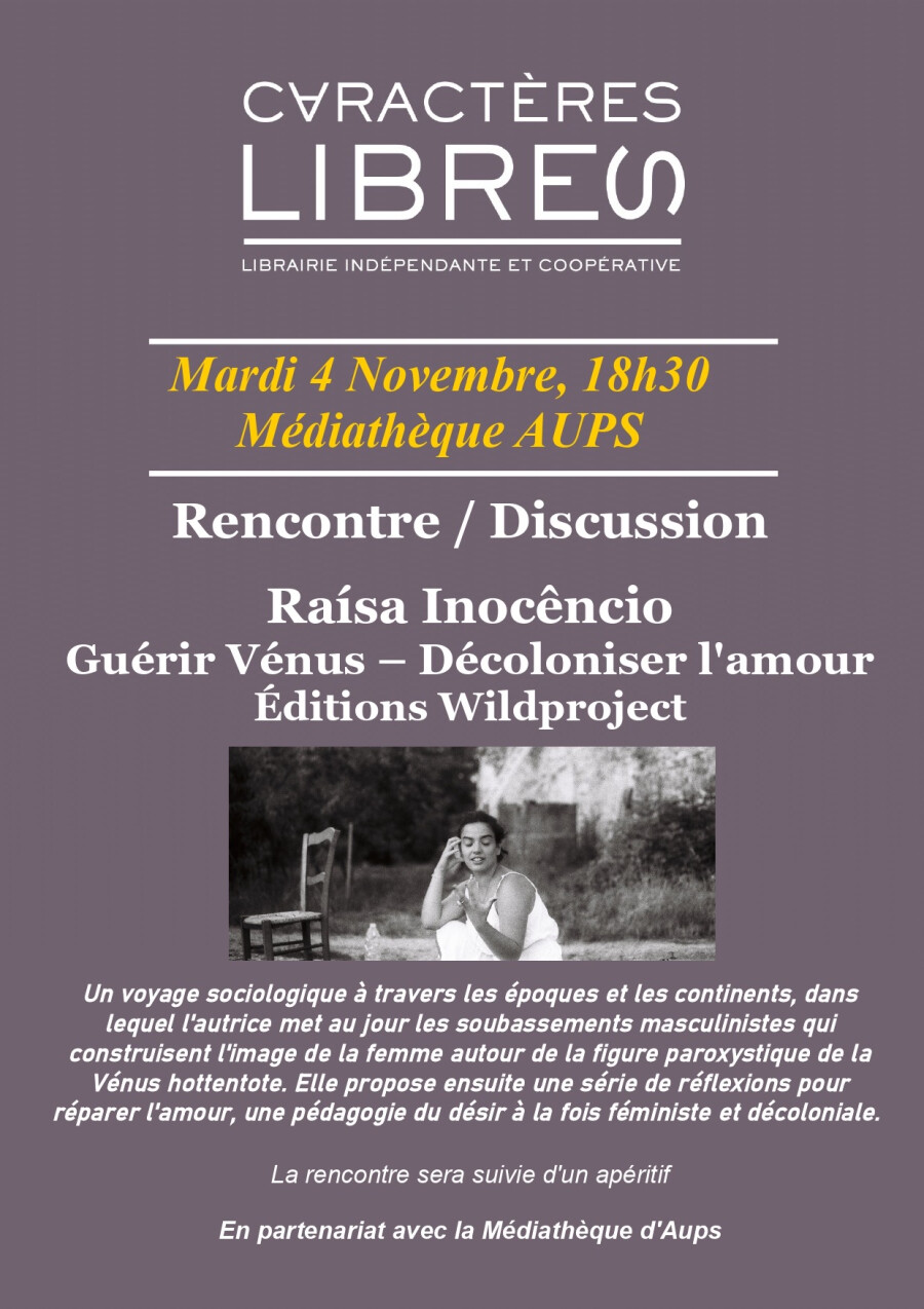 Nous accueillerons Raísa Inocêncio, autrice de Guérir Vénus – Décoloniser l’amour(Éditions Wildproject), pour une rencontre / discussion autour de son ouvrage.