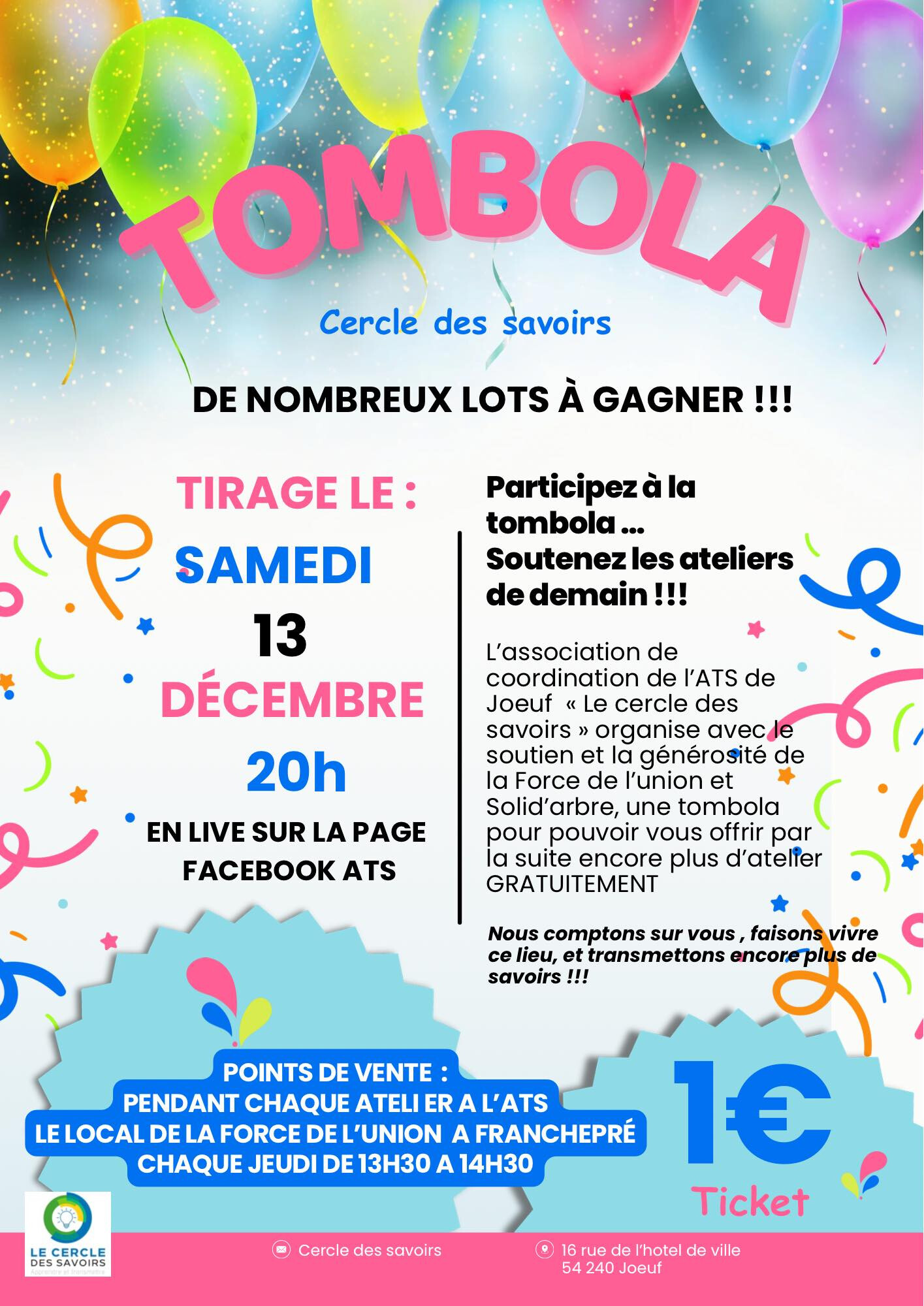 Dans le cadre de la « Grande tombola de Noël », on peut acheter un ticket de tombola à 2€ à :
